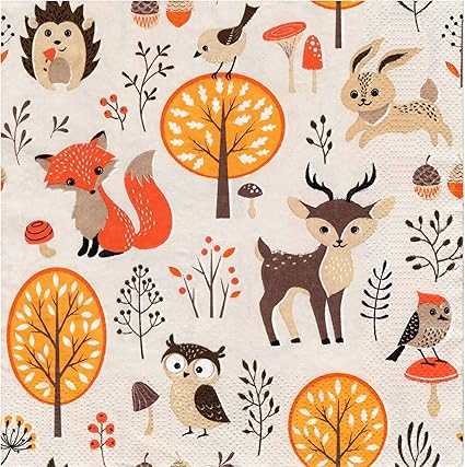 Celebrate in style with our Forest Animal Napkins! Featuring cute foxes, a squirrel, birds, an owl, a deer and a rabbit, these 3-ply napkins bring the charm of an autumnal forest to your table. Perfect for children's birthdays, outdoor parties, baby showers and autumn events - they add playful and festive accents. Made in Europe from FSC certified materials, these napkins are biodegradable and printed with water-based inks - an environmentally friendly choice. Each napkin measures 33 x 33 cm when open (16.5 x 16.5 cm folded) and is ideal for serving food, snacks and drinks. Whether you're planning a cosy fall party or a forest animal themed party, these high-quality napkins bring fun and sustainability to the table!
