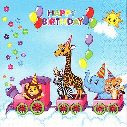 20 Napkins Train for Birthday, Funny Paper Napkins with Animals, Zoo, Lion, Elephant, Giraffe, Tiger, Children's Birthday, Happy Birthday, Decoupage, Table Decoration, 33 x 33 cm